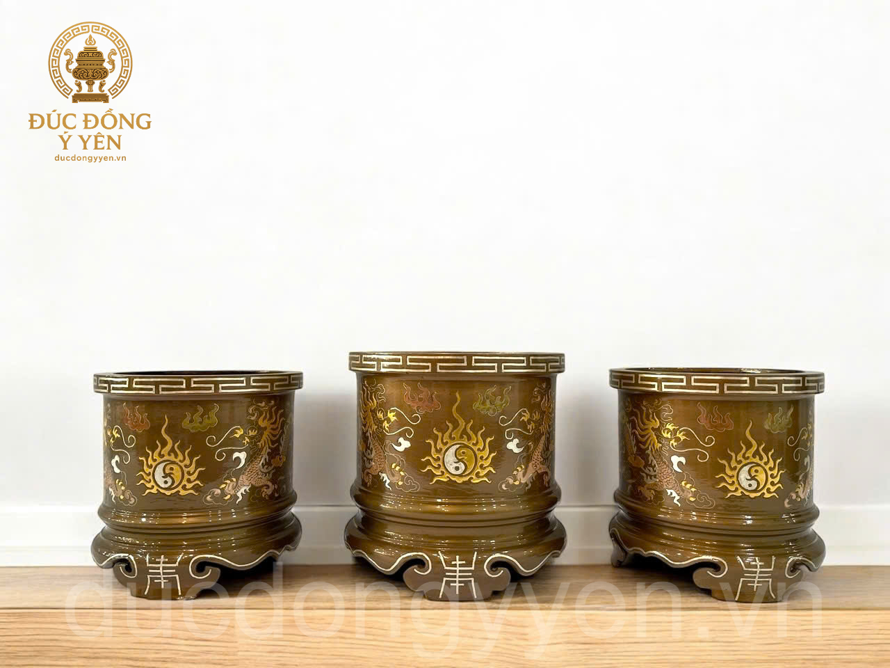 Bát hương khảm tam khí dát điểm vàng đúc đồng đỏ