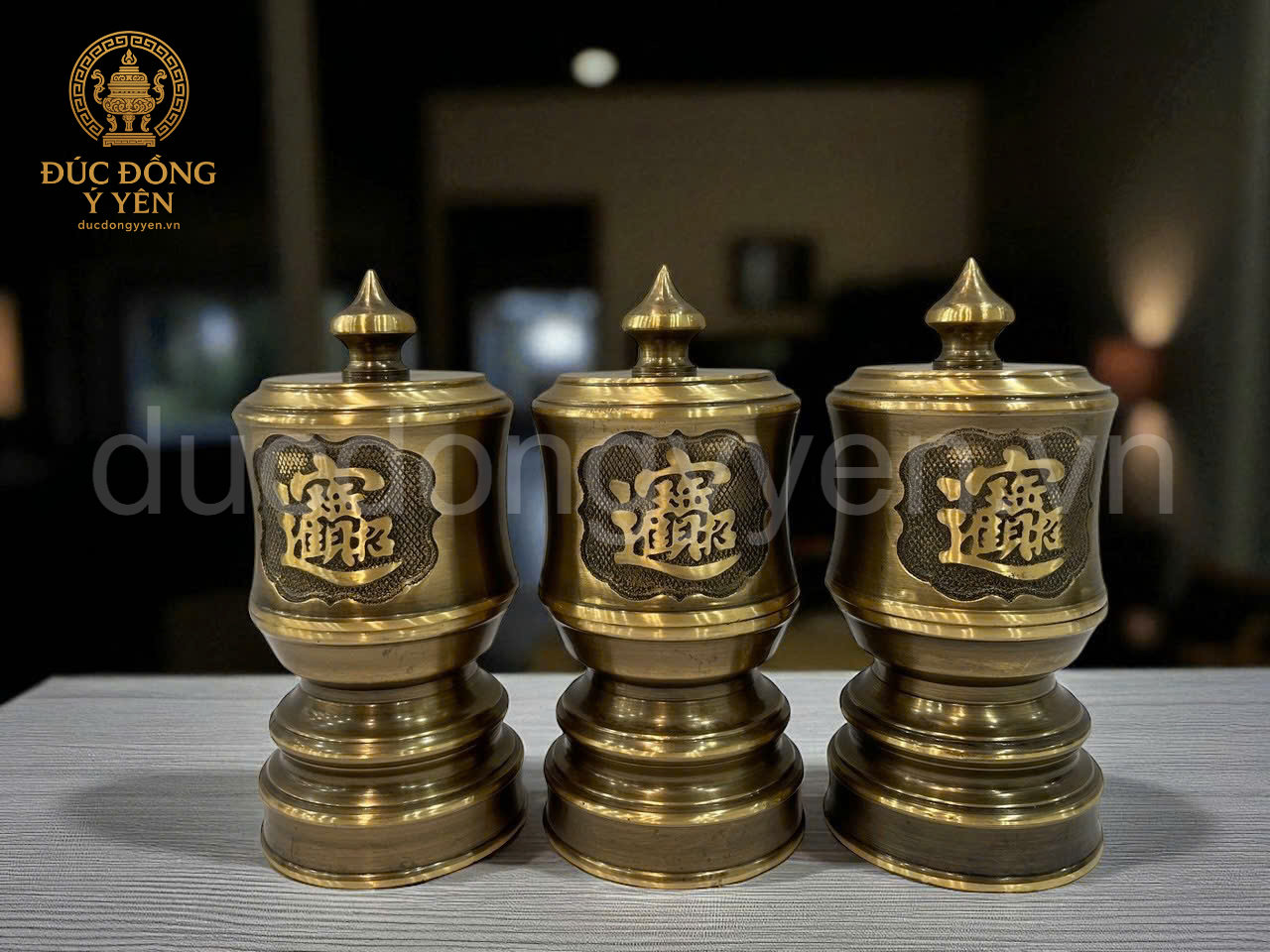 Bộ đài thờ bằng đồng vàng thau làm màu giả cổ là vật phẩm quan trọng trên ban thờ, gồm 3 đài đặt trên ngai dùng để đựng nước, rượu hoặc muối gạo dâng cúng tổ tiên và thần linh. Sản phẩm được chế tác thủ công tinh xảo, bề mặt xử lý màu giả cổ, mang đến vẻ trang nghiêm, cổ kính và linh thiêng .
