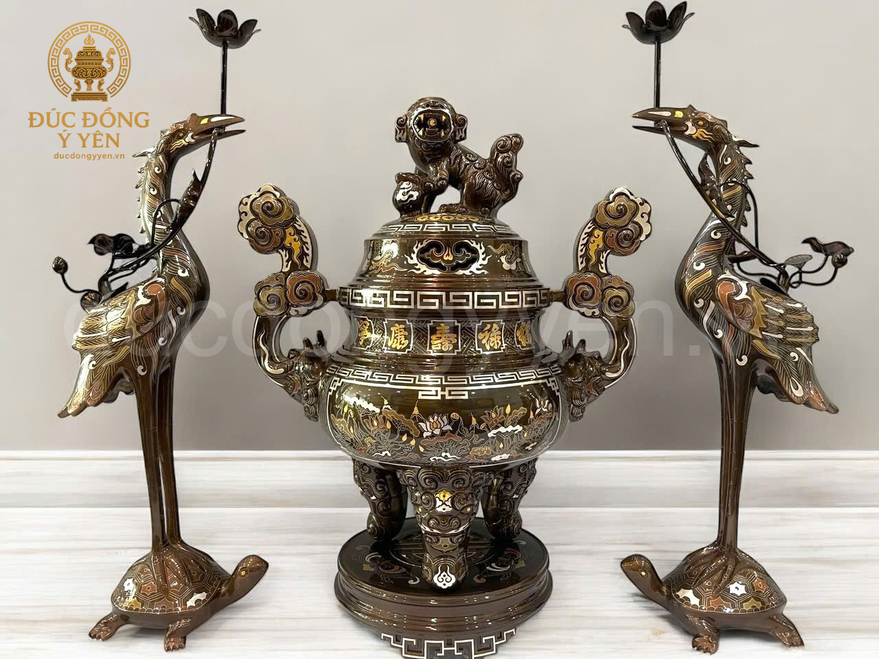 Bộ đỉnh tam sự đỉnh hạc khảm ngũ sắc hoa văn khảm sen
