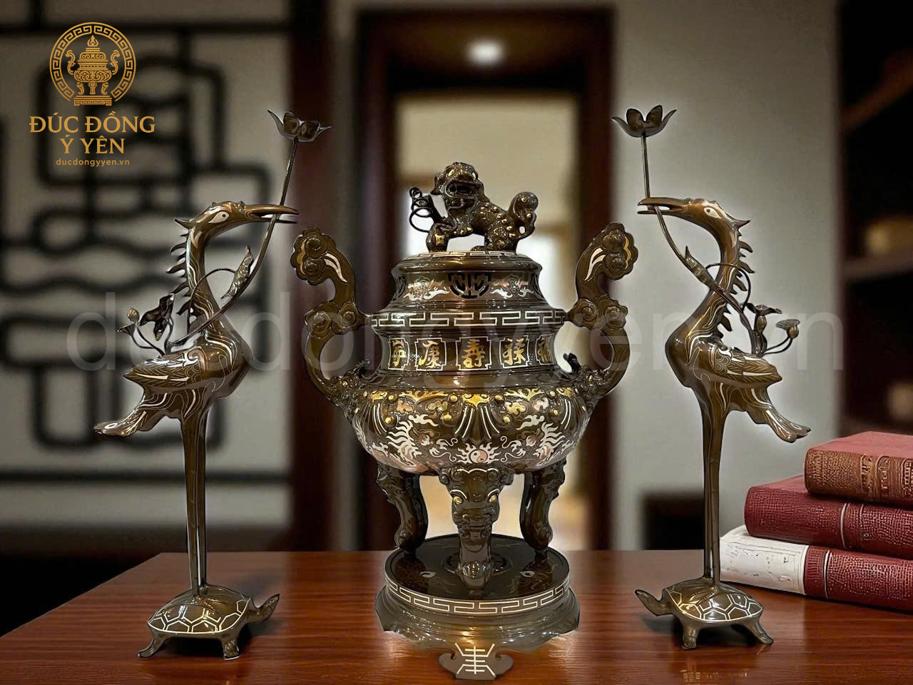 Bộ tam sự gồm 01 đỉnh thờ và 02 chân nến hoặc 02 hạc chầu , chế tác hoàn toàn thủ công từ đồng đỏ nguyên chất . Sản phẩm ứng dụng kỹ thuật khảm tam khí tinh xảo kết hợp dát điểm vàng nổi bật, mang lại vẻ đẹp sang trọng, bền vững. Nổi bật hơn cả là hoa văn sòi – biểu tượng của sự trường tồn, vững chãi và may mắn.