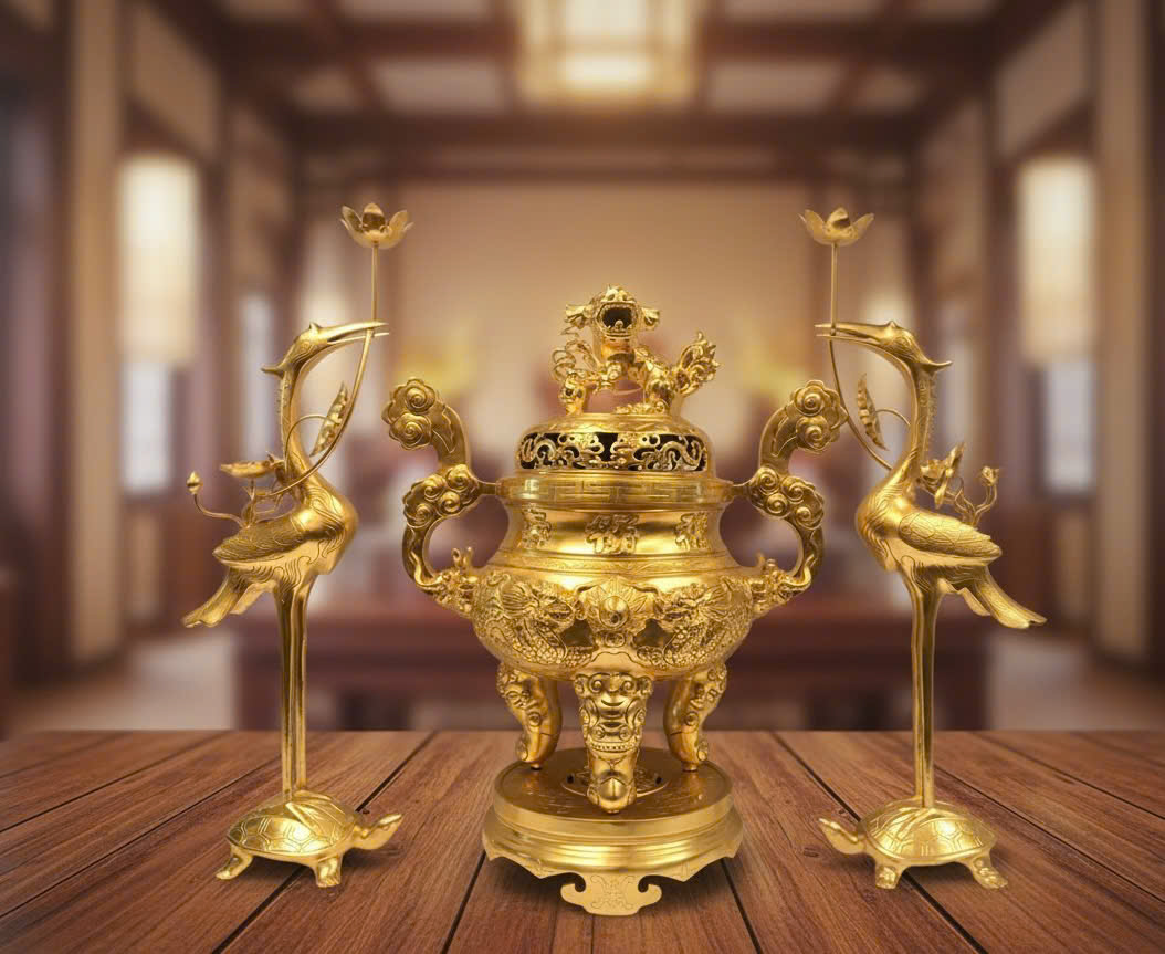 Cấu tạo: Gồm 5 món – 1 đỉnh thờ, 2 hạc chầu, 2 chân nến đồng, tạo bố cục cân đối – hài hòa trên bàn thờ.