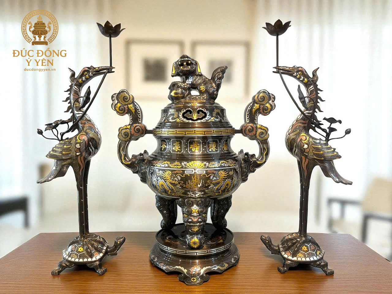 Bộ tam sự gồm 01 đỉnh thờ và 02 chân nến hoặc 02 hạc chầu , chế tác từ đồng đỏ nguyên chất , bề mặt được khảm ngũ sắc (vàng, bạc, đồng, tam khí) thủ công tinh xảo. Nổi bật với họa tiết rồng chầu mặt nguyệt – biểu tượng linh thiêng của quyền uy, thịnh vượng và trường tồn.