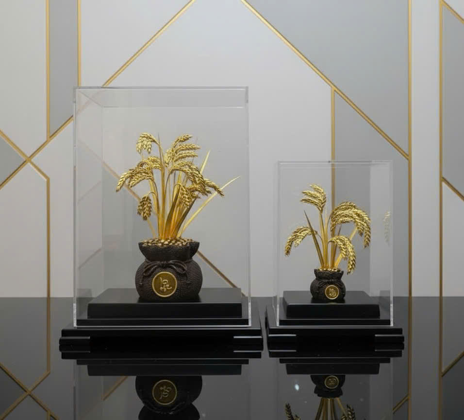 Chất liệu: Cành bông lúa chế tác từ hợp kim cao cấp, phủ lớp mạ vàng 24K sáng bóng; chậu đựng làm từ gỗ hoặc kim loại cao cấp.