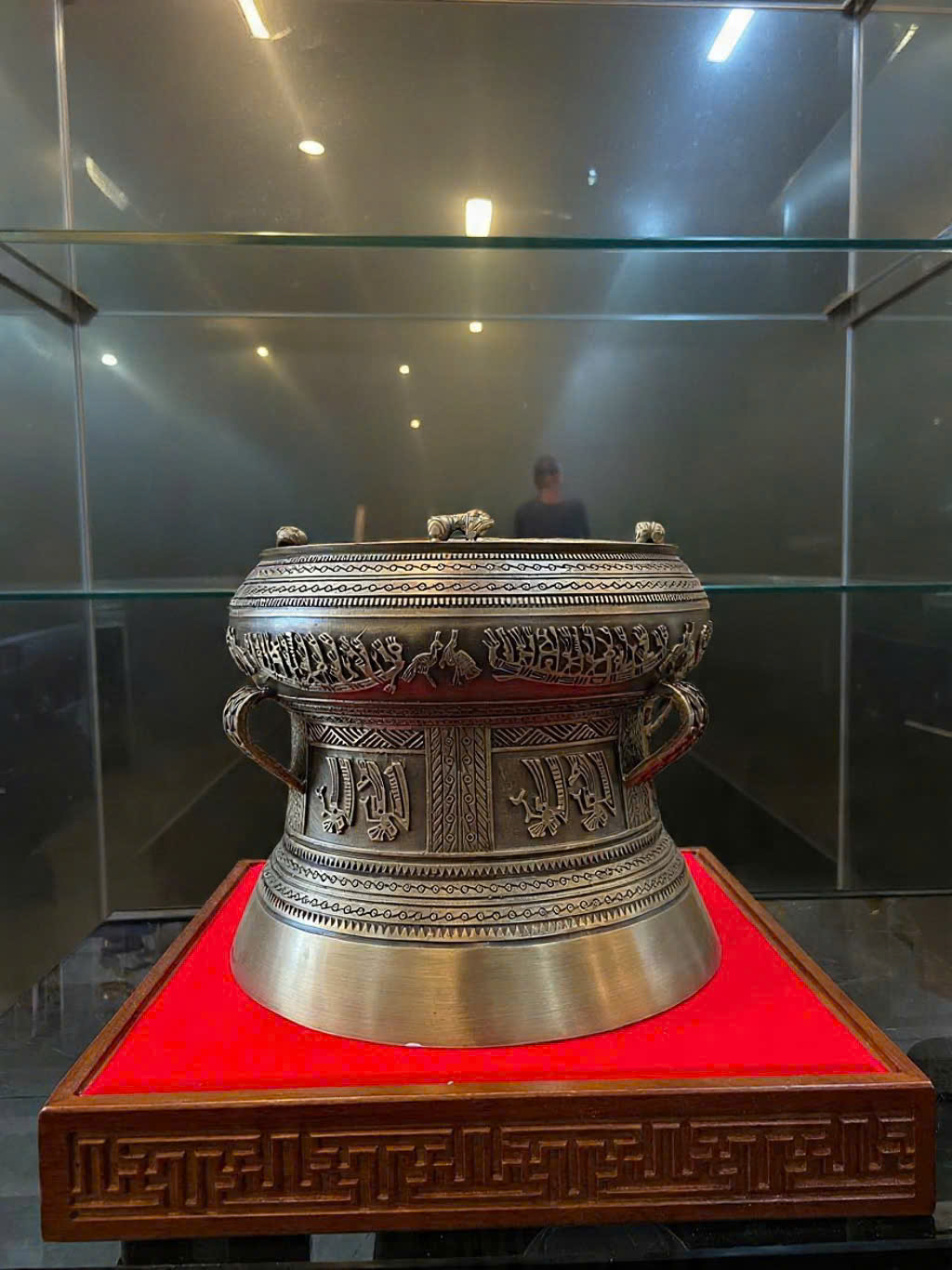 Hoa văn: Chạm khắc tinh xảo hình mặt trời, chim lạc, người giã gạo, đánh trống, đoàn người nhảy múa... , mô phỏng chính xác họa tiết trên Trống đồng Đông Sơn .