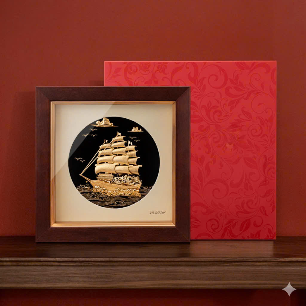 Chất liệu: Hình thuyền chế tác cao cấp, mạ vàng 24K ; nền tranh màu đen sang trọng; khung gỗ cao cấp