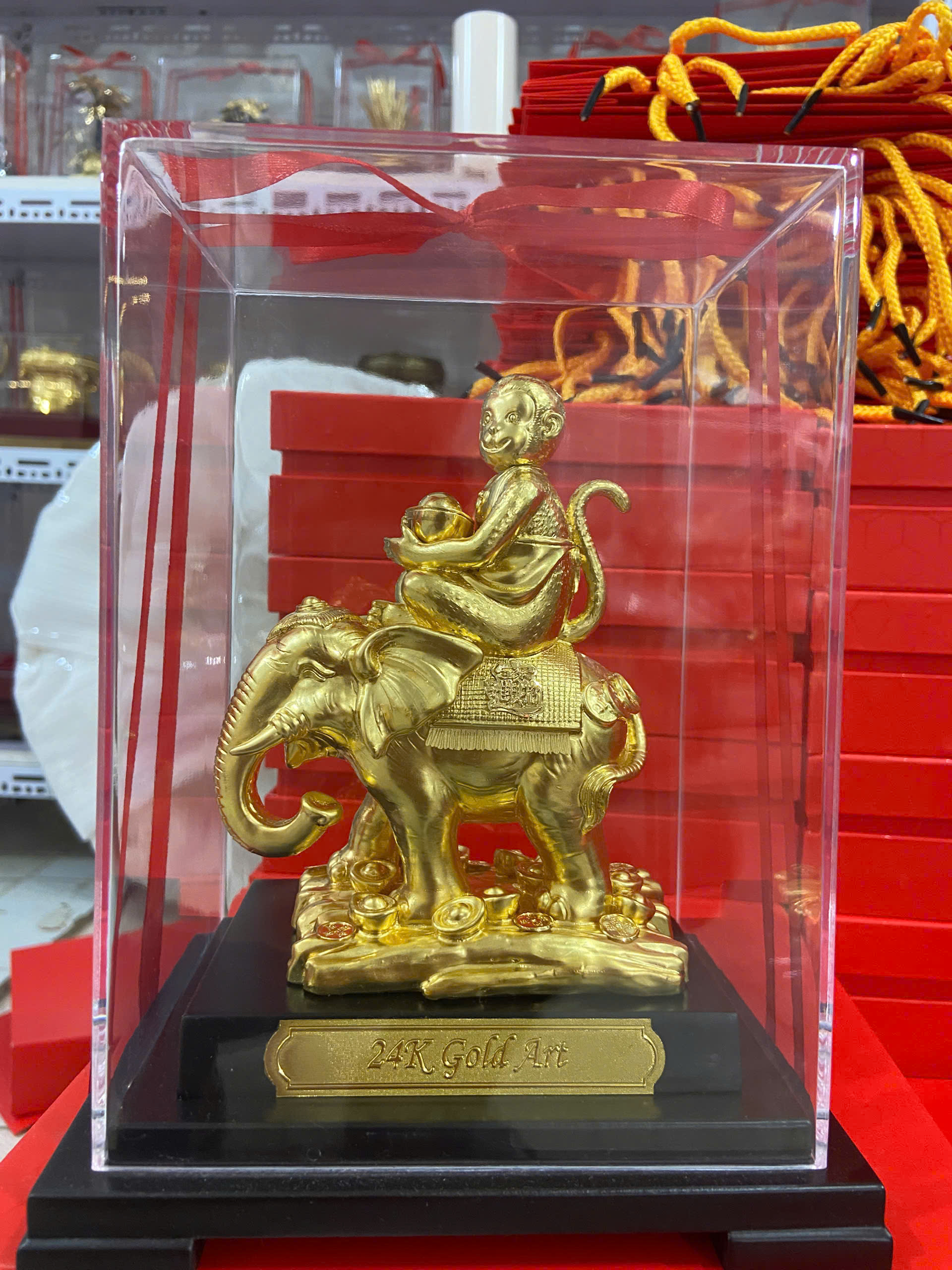 Tượng khỉ ôm thỏi vàng cưỡi voi dát vàng 24k KT 22CM