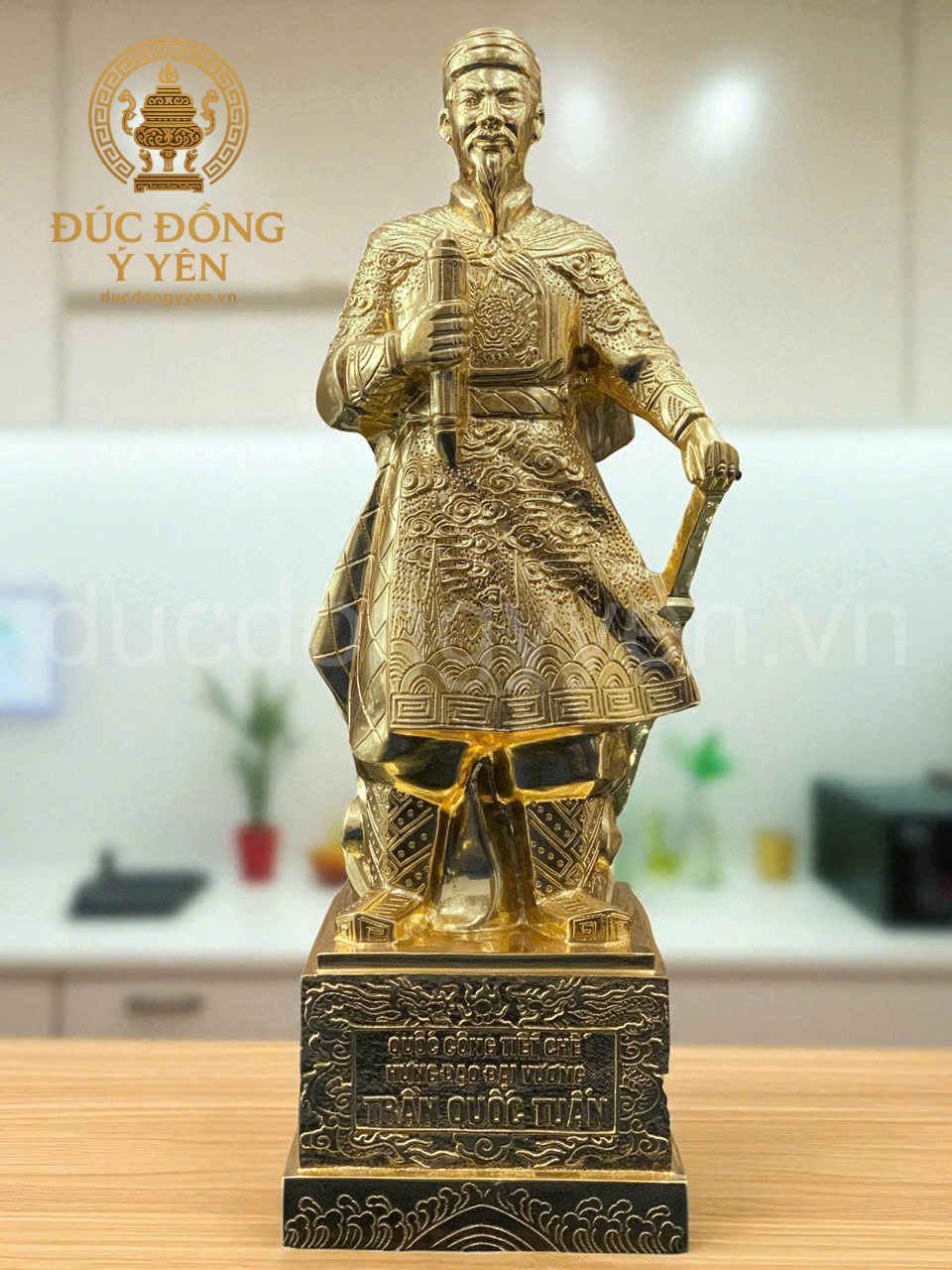 Tượng Trần Hưng Đạo đúc đồng đỏ dát vàng 9999, đúc nổi hoa văn là tác phẩm nghệ thuật mang giá trị lịch sử, tâm linh và phong thủy sâu sắc. Tượng được chế tác thủ công từ đồng đỏ nguyên chất , bề mặt dát vàng 9999 sang trọng, các chi tiết hoa văn được đúc nổi tinh xảo , khắc họa hình ảnh vị anh hùng dân tộc Trần Hưng Đạo uy nghi, bất khuất.